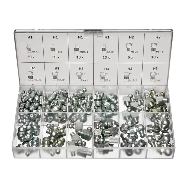 The LAGN 120 grease fitting kit contains a full range of 120 standardised conical grease fittings made of precision steel, zinc plated, hardened and blue chromed.